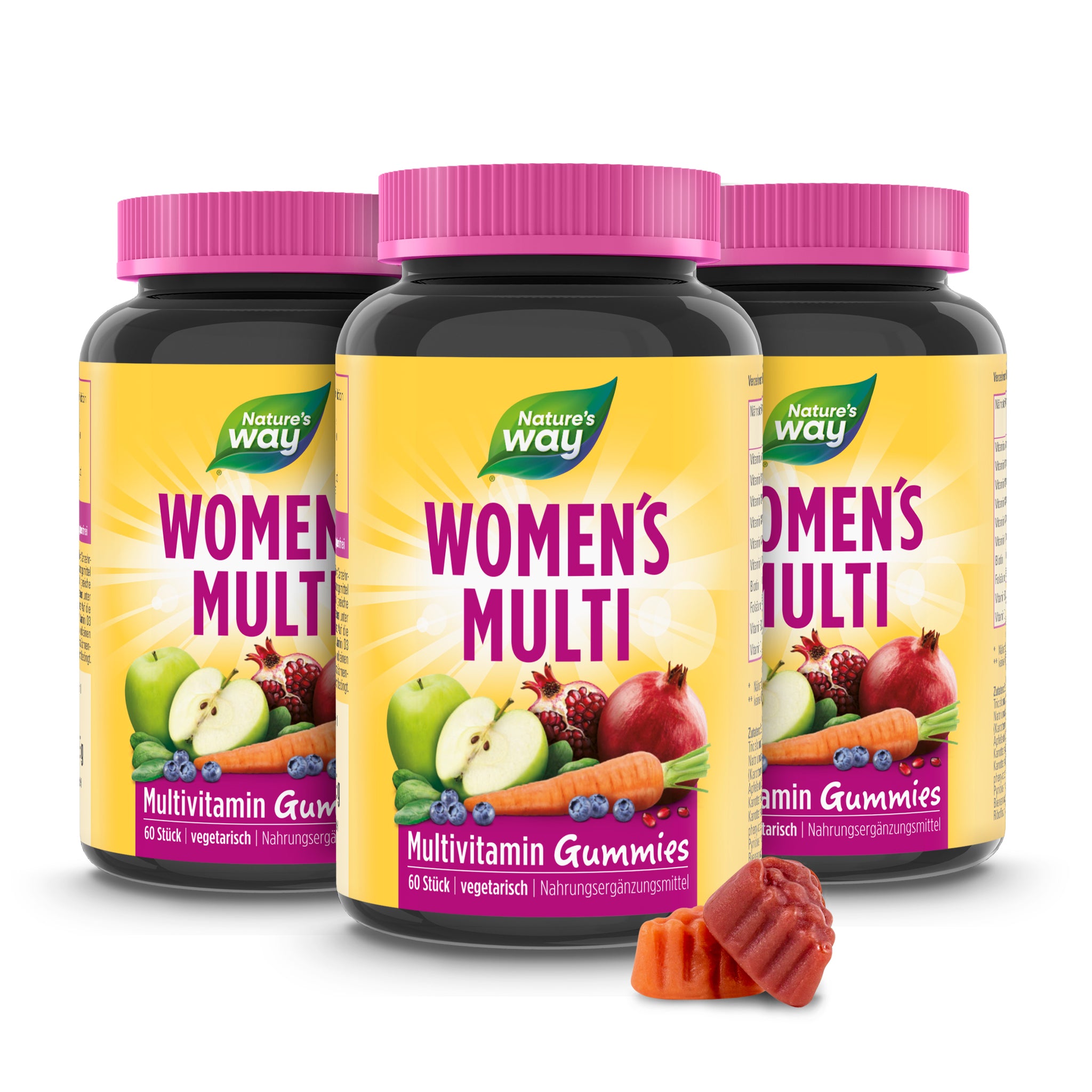 Gezielt entwickelt für die Bedürfnisse von Frauen: Die Women’s Multi Gummies von Nature’s Way sind ein hochwertiges Nahrungsergänzungsmittel, das speziell auf die Anforderungen des weiblichen Körpers abgestimmt wurde. Die durchdachte Kombination aus Vitamin A, C, D3, E, allen acht B-Vitaminen sowie den wichtigen Spurenelementen Bor, Jod und Zink unterstützt gezielt die Gesundheit² und dein Wohlbefinden. Durch die sorgfältig ausgewählte Rezeptur bieten unsere Women’s Multi Gummies eine effektive Ergänzung zu einer ausgewogenen Ernährung – ideal für Frauen, die ihre tägliche Nährstoffzufuhr sinnvoll ergänzen möchten.. Die Multivitamin Gummies versorgen dich mit 15 Nährstoffen. Für Energie im Alltag sorgen die Vitamine B6 und B12¹, Vitamin C, D und Zink unterstützen dein Immunsystem.² Die Frauen Vitamine enthalten außerdem Zink für schöne Haut, Haare und Nägel³ und Vitamin E, das die Zellen vor oxidativem Stress schützt.⁵. – 60 Multivitamin-Gummies mit Beeren-Geschmack. – Mit 15 wichtigen Vitaminen und Spurenelementen. – Vegetarisch und frei von Gelatine, Gluten und Laktose. ¹Vitamin B6, B12 tragen zu einem normalen Energiestoffwechsel bei. ²Vitamin C, D & Zink tragen zu einer normalen Funktion des Immunsystems bei. ³Zink trägt zur Erhaltung normaler Haut, Haare und Nägel bei. ⁴Biotin trägt zur Erhaltung normaler Haut und Haare bei. ⁵Vitamin E trägt dazu bei, die Zellen vor oxidativem Stress zu schützen