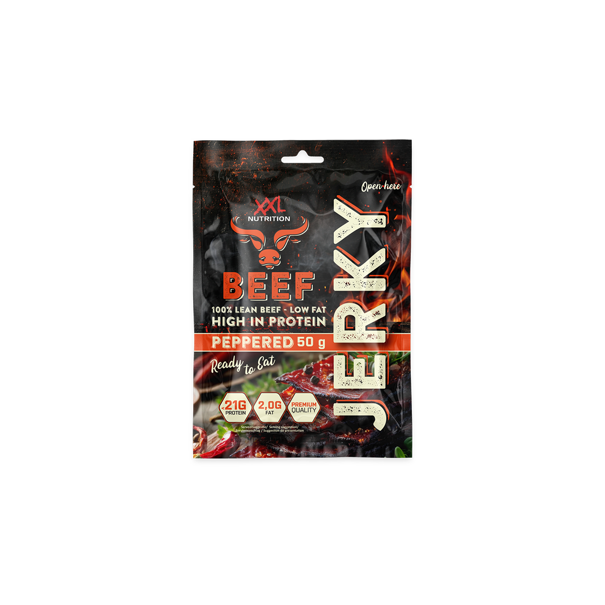 Nährwertangaben von Beef Jerky Dieser leckere, verzehrfertige Snack enthält bis zu 44 % Eiweiß, was mit dem durchschnittlichen Eiweißgehalt eines herkömmlichen Eiweißriegels vergleichbar ist. Darüber hinaus enthält das Beef Jerky im Vergleich zu ähnlichen Snacks weniger Salz, Kohlenhydrate und Fette. Genuss ohne Reue! Haltbarkeitsdauer und Zubereitung Unser Beef Jerky ist verzehrfertig, sodass Du den leckeren Snack überall genießen kannst. Ganz gleich, ob Du einen Snack nach einer intensiven und schweißtreibenden Trainingseinheit, eine Zwischenmahlzeit im Büro oder während einer langen Autofahrt benötigst: Er ist der ultimative proteinreiche Snack. Im Gegensatz zu anderen Fleischprodukten ist das Beef Jerky dank des Trocknungsprozesses länger als ein Jahr haltbar. Außerdem muss dieser Snack nicht im Kühlschrank aufbewahrt werden. Wir empfehlen, das Beef Jerky nach dem Öffnen der Packung innerhalb von 24 Stunden zu verzehren, um eine