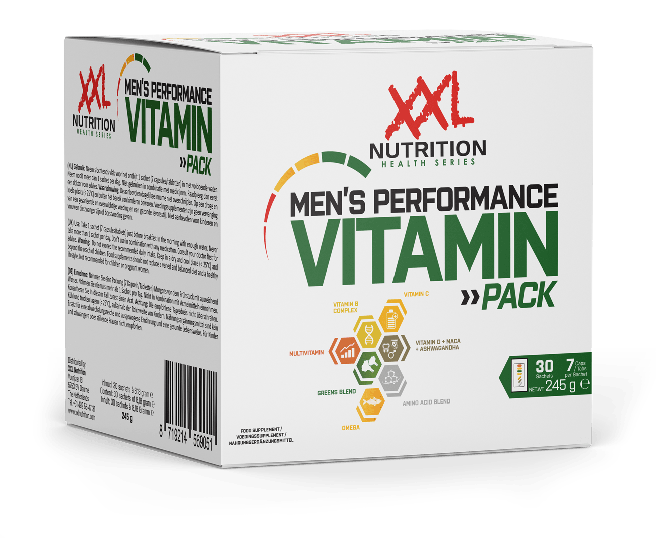 Unser Körper benötigt eine Vielzahl von Nährstoffen, darunter Vitamine und Mineralien. Diese werden zum Großteil über die Ernährung aufgenommen, aber wenn Du regelmäßig Sport treibst, ist es natürlich besonders wichtig, auf die Aufnahme von Mikronährstoffen zu achten. Woher weißt Du aber, welche Nahrungsergänzungsmittel Du als Sportler genau brauchst? Um es Dir einfach zu machen, hat XXL Nutrition das komplette Nahrungsergänzungsmittel für Sportler zusammengestellt: Men’s Performance Vitamin Pack! Alles, was Dein Körper braucht, in einem Paket! Men’s Performance Vitamin Pack ist das umfassendste Nahrungsergänzungsmittel für männliche Sportler. Men’s Performance Vitamin Pack bietet eine ausgewogene Mischung aus mehr als 30 aktiven Inhaltsstoffen, einschließlich verschiedener Vitamine und Mineralstoffe, Omega-3, Gemüseextrakte und Aminosäuren. Also alles, was Du als leidenschaftlicher Sportler brauchst, in einem einzigen praktischen