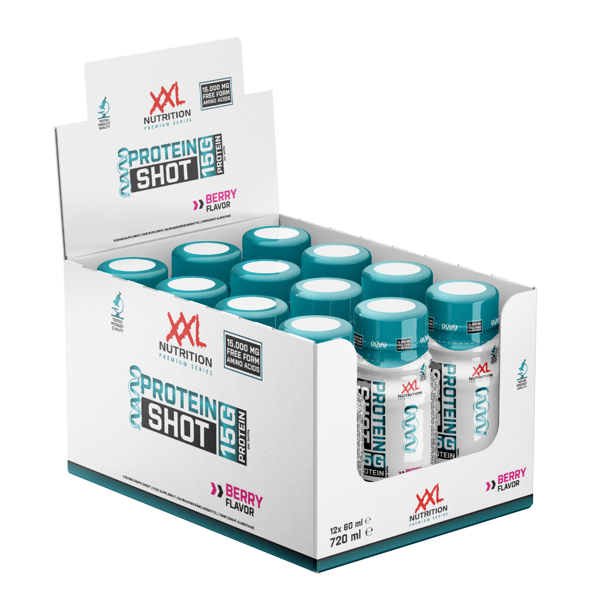 15 Gramm Protein pro Protein Shot Als Sportler hast du einen höheren Proteinbedarf. Der Grund dafür ist, dass der Körper die Aminosäuren aus dem Protein für die Regeneration der Muskeln nach dem Training nutzt. Dieses Protein erhältst du zum Beispiel durch Lebensmittel wie Fleisch, Milchprodukte, Eier, Fisch, Hülsenfrüchte und Linsen. Aber brauchst du schnell ein paar zusätzliche Proteine? Dann kannst du die XXL Nutrition Protein Shots verwenden. Nimm diesen Protein-Shot überallhin mit, schüttele ihn einfach und du hast im Handumdrehen 15 Gramm Protein zu dir genommen. Absolut perfekt! Der Protein Shot enthält 15 Gramm Molkeprotein und ist praktisch frei von Zucker und Fett. Die Nährwerte sprechen für sich: 15 Gramm Whey Protein, 0,02 Gramm Fett und 0,02 Gramm Zucker pro Shot. Dadurch enthält ein Protein Shot nur 61 kcal und passt perfekt in einen Ernährungsplan zur Gewichtsabnahme oder zum Trockentraining. Was sind die