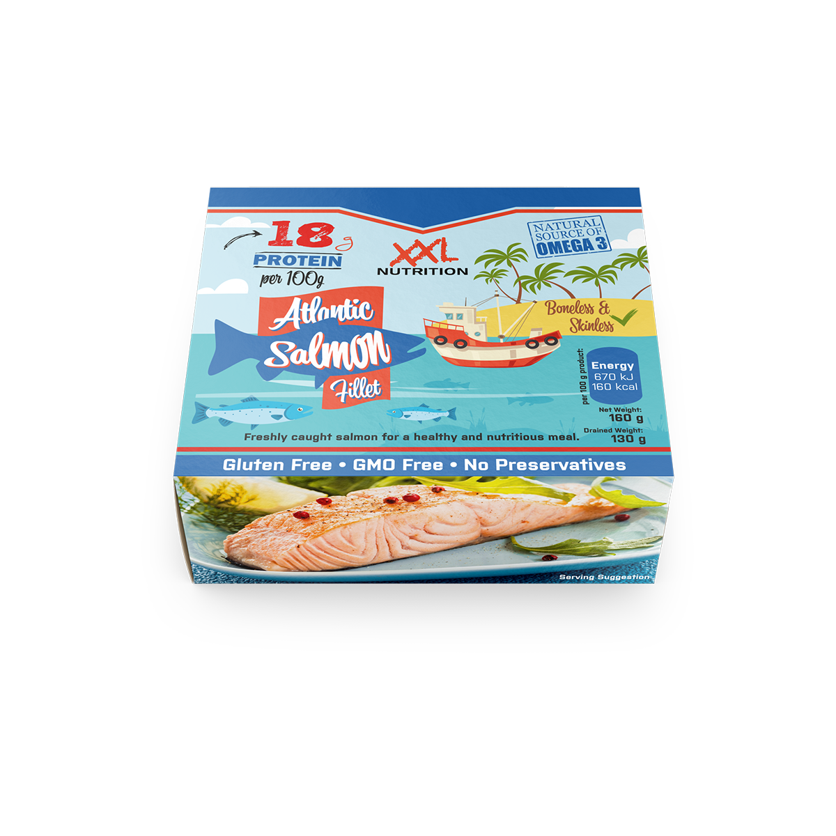 Atlantisches Lachsfilet Atlantic Salmon Filet. Dieses köstliche Lachsfilet wird in praktischen 160-Gramm-Dosen geliefert und enthält nicht weniger als 23 Gramm Protein! Mit Ausnahme von Lachs enthalten die Dosen nur etwas Salzzusatz, sodass Sie Ihren Körper nur mit natürlichen und reinen Zutaten versorgen. Lachs ist auch eine natürliche Quelle für Omega 3, das sowohl aus EPA als auch aus DHA besteht. EPA und DHA tragen zur normalen Funktion des Herzens bei *. Atlantisches Lachsfilet enthält nicht weniger als 10% Fett (davon nur 1,6% gesättigt) und keine Kohlenhydrate. Atlantic Salmon Filet ist auch glutenfrei und frei von GVO-Rohstoffen. * Bei 250 mg EPA und DHA pro Tag. Wie verwende ich Atlantisches Lachsfilet? Der Lachs in den Atlantic Salmon Filet-Dosen ist gebrauchsfertig. Sie können diese direkt aus der Packung essen, aber Sie können den Lachs auch zu einem Salat geben und daraus ein proteinreiches Mittagessen machen.