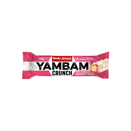 YamBam Crunch Riegel von Body Attack mit White Chocolate Raspberry Vanilla Geschmack in der 0.825KG Packung. YamBam Crunch von Body Attack Der YamBam Riegel macht das Unmögliche möglich. Mach dich bereit für den leckersten Crunch deines Leben! Der Riegel vereint hochwertiges Protein, knackige Schokolade und super leckere crunchige Crispies. Mit über 30 % Protein und extra Ballaststoffen hält der Proteinriegel nicht nur lange satt, sondern verhindert auch jegliche Heißhungerattacken! Der süß-knusprige, leckere Snack ist der ideale Begleiter. Der Energieriegel überzeugt mit wenig Zucker und einer palmölfreien Herstellung. Also, worauf wartest du noch? Greif zu! Allergene: Enthält Gerste, Soja, Milcherzeugnisse. Kann Spuren von Gluten, Erdnüssen, Ei und Schalenfrüchten enthalten. Verzehrempfehlung: Nach belieben genießen. Dein ultimatives Crunch-Erlebnis!