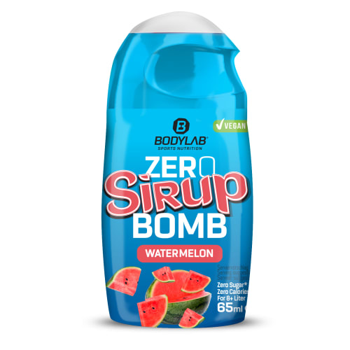 ZERO Sirup BOMB Bodylab24 mit Wassermelone Geschmack in der 0.065L Packung. ZERO Sirup BOMB – in der praktischen 5er Box mit verschiedenen Geschmacksvarianten Hochkonzentriert und praktisch kalorienfrei – eine ideale Kombination für einen Getränkesirup. Erhältlich in vielen leckeren Sorten und Kombinationen. Du hast die Wahl: – Zero Sirup BOMB einzeln als 65 ml Variante nach Wahl – im 5er MIX zum Zusammenstellen nach Wahl – in verschiedenen Boxen mit je 5 Geschmacksvarianten Das kleine und praktische 65 ml Fläschchen ist ideal zur einfachen Dosierung, perfekt für den Transport in Sport- oder Handtasche und ist bei der geringen Größe problemlos im Büro oder zu Hause unterzubringen. So sorgst Du im Alltag oder beim Sport mit nur geringer Dosierung für Abwechslung bei Deinem täglichen Getränkemanagement – und das nicht nur im Sommer sondern im ganzen Jahr. Nur wenigen Tropfen ZERO Sirup BOMB mit Wasser mischen (Verhältnis 2ml Sirup – ca. 250ml stilles oder kohlensäurehaltiges Wasser) und fertig ist das lecker fruchtige Getränk im Geschmack Deiner Wahl. Eine ideale, ernährungs- und kalorienbewusste Alternative zu den klassischen Erfrischungsgetränken mit reichlich Zuckeranteil, die für Sportler in der Regel nicht ins gewählte Ernährungskonzept passen. Aus jedem kleinen 65 ml Fläschchen lässt sich im Mischverhältnis 1:124 (Beispiel: 2 ml ZERO Sirup BOMB + 248 ml Wasser = 250 ml verzehrfertiges Getränk) mindestens 8 l fertiges Getränk mischen. Je nach Vorliebe bei Süße und Geschmacksintensität kann etwas mehr oder weniger ZERO Sirup BOMB zugefügt werden – je mehr Sirup auf die gewählte Menge Wasser, desto intensiver sind Geschmack und Süße. Warum ZERO Sirup BOMB von Bodylab24 Die ausreichende Aufnahme von Flüssigkeit über den Tag verteilt, ist nicht nur für die körperliche Leistungsfähigkeit von Sportlern ein absolutes Muss. Auch das allgemeine Wohlbefinden und die allgemeine, körperliche Belastbarkeit hängen von ausreichender Nahrungs- und Flüssigkeitsaufnahme ab. Und das gilt nicht nur in den Sommermonaten oder bei intensiven Trainingseinheiten, bei denen man sich bewusst ist, dass der Körper eine ausreichende Flüssigkeitsaufnahme benötigt. Die erste Wahl sind da häufig Softdrinks oder Wasser und insbesondere die Softdrinks sind meist sehr beliebt. Ihr großer Nachteil, sie weisen einen hohen Kalorienanteil auf, da in zahlreichen Varianten sehr viel Zucker enthalten ist. Wasser ist da sicher die bessere Wahl, allerdings ist dies sehr neutral im Geschmack und bietet keinerlei Abwechslung. Unser ZERO Sirup BOMB kann hier für Abhilfe schaffen und mit nur ein paar Spritzern im Wasserglas immer wieder für Abwechslung sorgen – und das praktisch kalorienfrei (nur 2 kcal je 250 ml Wasser Sirup Gemisch – nach Mischverhältnis siehe oben). Perfekt für den Alltag, bei einer bewussten und / oder kalorienreduzierten Ernährungsweise oder beim Sport. Geeignet für die ganze Familie. Nicht unverdünnt verzehren und vor Gebrauch schütteln. Verzehrempfehlung: Flasche vor jedem Gebrauch schütteln. Getränkekonzentrat nicht unverdünnt verzehren.Mische für eine Portion 1 Teil ZERO Sirup BOMB mit 124 Teilen Wasser – Beispiel: 2 ml Sirup mit 248 ml Wasser ergeben 250ml verzehrfertiges Getränk.Ein 65 ml Fläschchen ergibt 8 Liter des in diesem Mischverhältnis zubereiteten Getränkes. Je mehr ZERO Sirup BOMB zugemischt wird, desto intensiver und süßer ist der Geschmack des fertigen Getränkes, damit verringert sich auch die Gesamtmenge, die aus 1 x 65 ml hergestellt werden kann. Mix it – einfach stilles oder kohlensäurehaltiges Wasser und einen kleinen Spritzer aus dem Zero Sirup Bomb Fläschchen mischen und fertig ist Dein lecker fruchtiges und kalorienarmes Getränk für Alltag und Sport.Für Abwechslung sorgen zahlreiche Geschmacksvarianten – wähle Deine Favoriten oder bestell Dir direkt eine Mix-Box mit jeweils 5 verschiedenen Geschmacksvarianten.